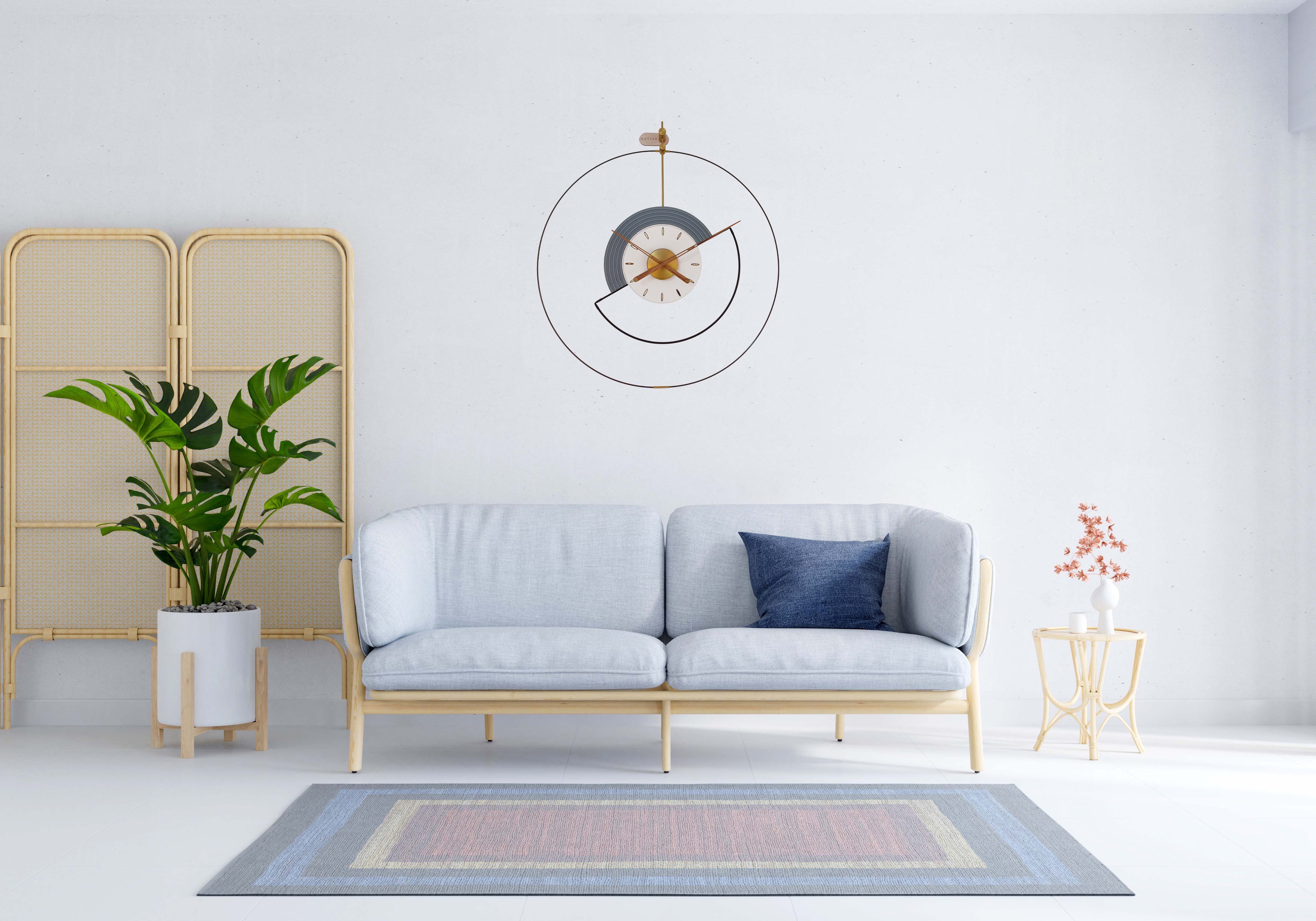 The Cosmic Cadence Wall Clock brings a sense of rhythm and harmony to any space. With its unique circular and half-circle design, it creates a modern yet timeless look. Crafted from eco-board, iron, and PVD-coated stainless steel, its Regent Gray, Spring Wood, and Golden Grass tones add warmth and elegance.