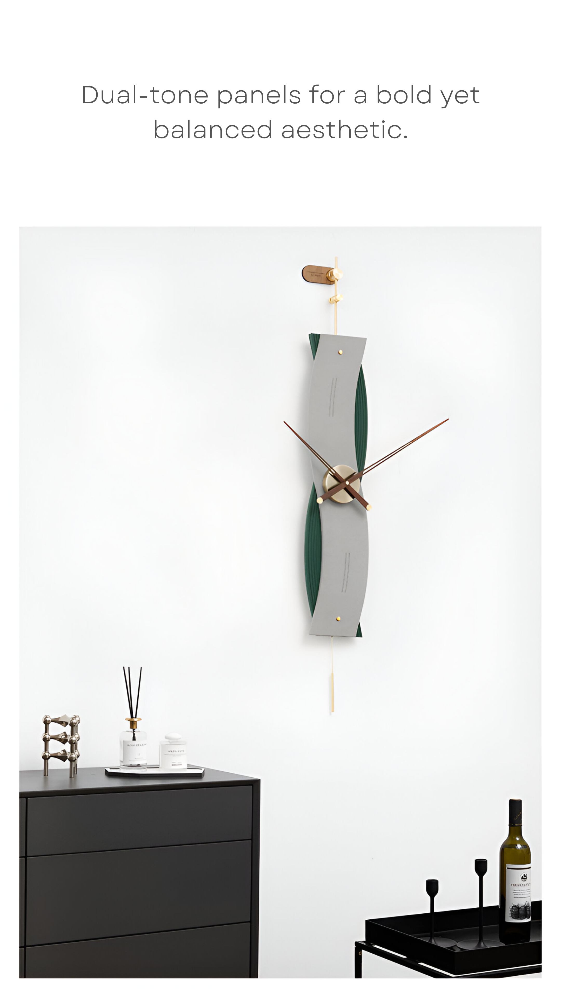 This clock features a blend of sustainable materials, including eco-board, iron, and PVD-coated stainless steel, complemented by wooden hands, ensuring durability and long-lasting quality.